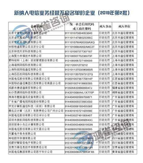 2019年一季度依據(jù)電信條例、電信業(yè)務(wù)經(jīng)營許可管理辦法等相關(guān)規(guī)定,電信管理機(jī)構(gòu)對在經(jīng)營電信業(yè)務(wù)、開展互聯(lián)網(wǎng)信息服務(wù)、落實(shí)網(wǎng)絡(luò)與信息安全責(zé)任等方面存在違規(guī)行為的27家企業(yè),給予警告、罰款等行政處罰并將其新納入電信業(yè)務(wù)經(jīng)營不良名單現(xiàn)予以公布,詳細(xì)信息可登陸全國電信業(yè)務(wù)市場綜合管理信息系統(tǒng)查詢。